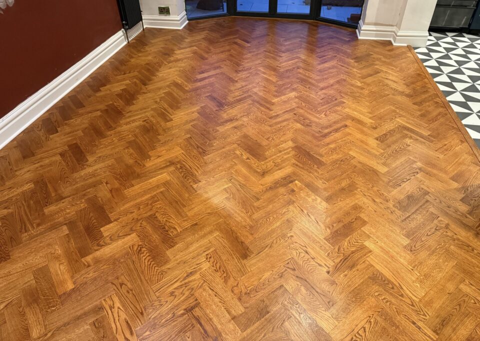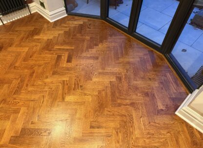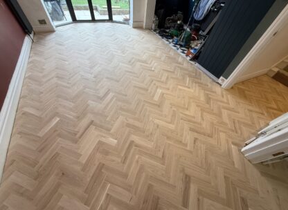 Once the entire floor had been laid the oak blocks were sanded on site before Lecol 5500 filler was used to fill any imperfections across the floor and left to cure overnight.