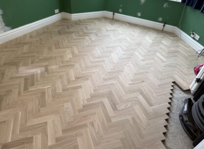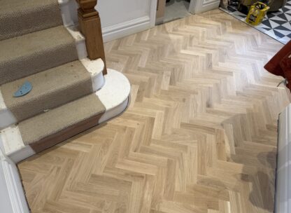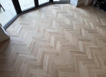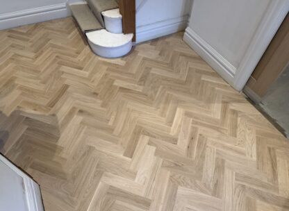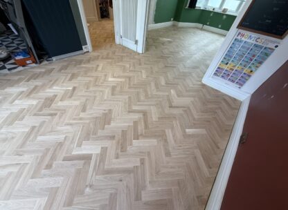 Once the lacquer had fully cured a combination of white primed quadrant and 22mm oak flatplate was fixed to mask the expansion gap left around the perimeter of the floorspace, whilst oak thresholds were used to transition parquet to floor tiles.