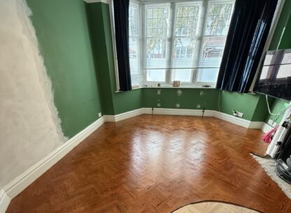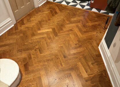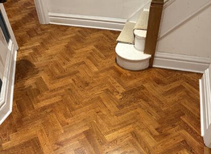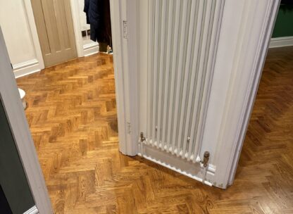 Here our parquet blocks have been fitted above a pre-prepared subfloor of 9mm plywood, with Mapei Renovation self levelling compound being used to achieve the height deviation tolerance of +/- 3mm over a 3m area.